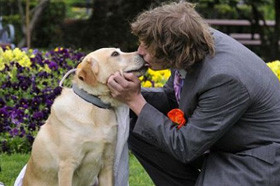 Ele organizou uma cerimónia de casamento com a sua amada labrador e selou o compromisso com um beijo, tal como se vê na foto.